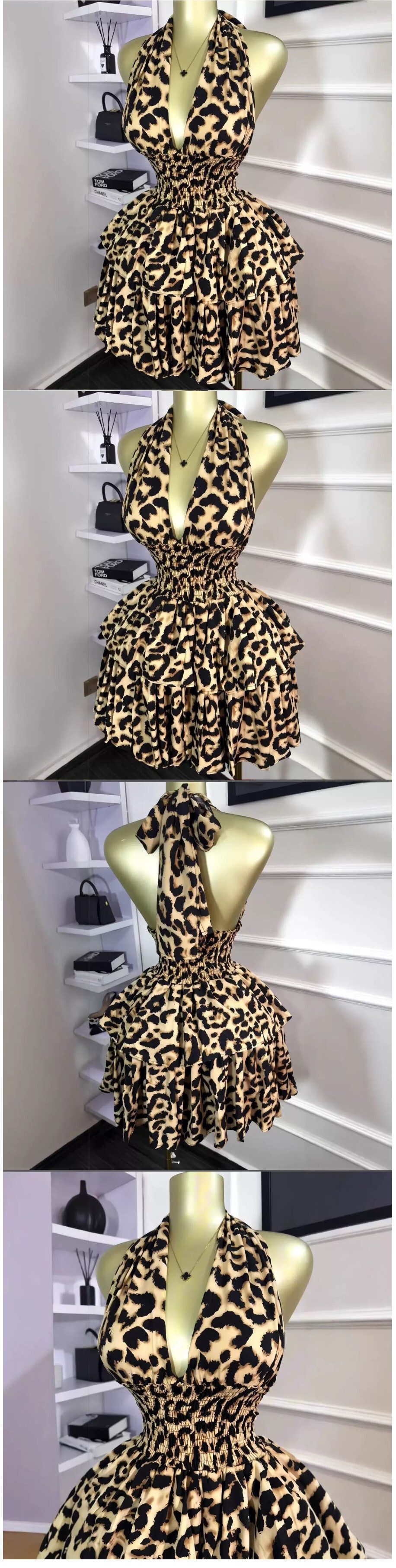 辣妹女裝新款無袖豹紋收腰皺褶蓬蓬短款連衣裙