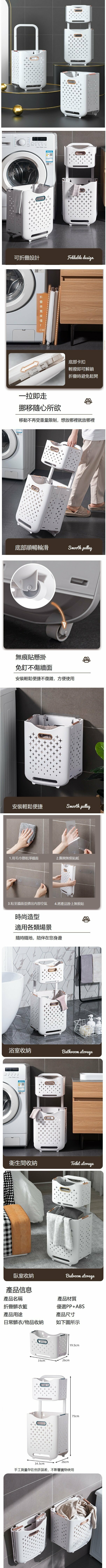 熱推免打孔可折疊滾輪髒衣籃臟衣籃污衣籃(組合裝白色)(長34.5cm寬26cm高75cm)