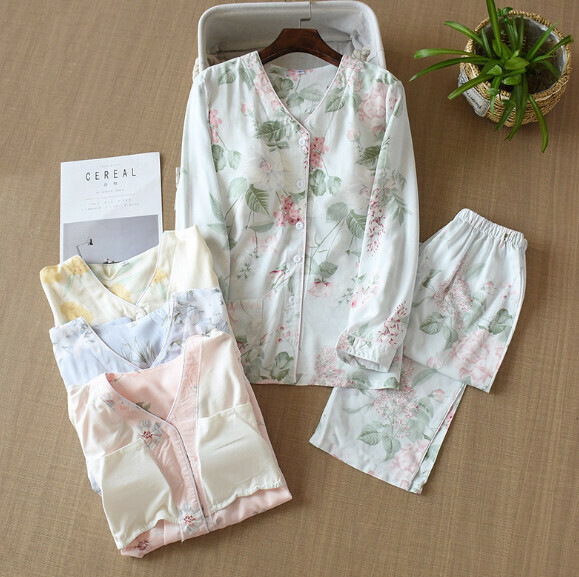 熱推帶胸墊長袖長褲睡衣套裝(黃色大花)【M-XL碼】【下單後聯絡客服確認發貨尺碼】
