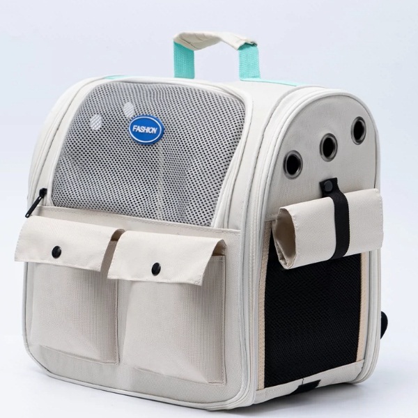寵物背包雙肩兔子包手提袋-米白色【三面鏤空通風透氣防應激捲簾】