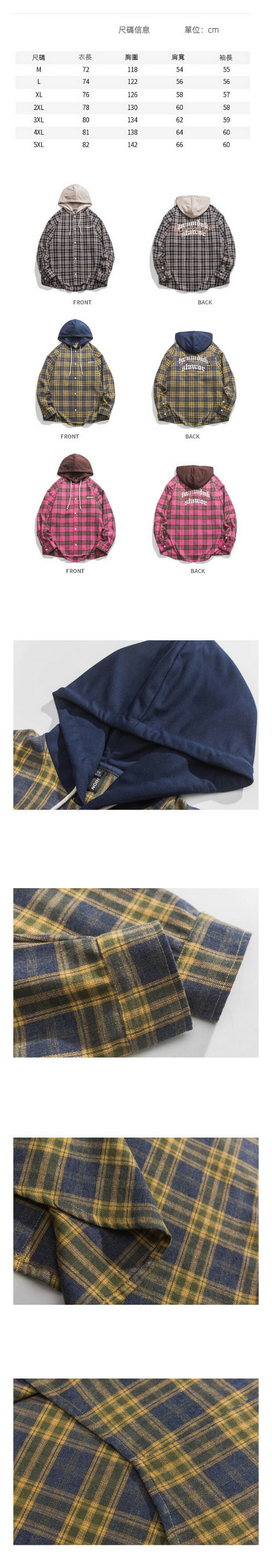 熱推格子連帽拼色長袖襯衫(黃色)【M-5XL碼】【下單後聯絡客服確認發貨尺碼】