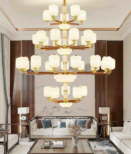 爆款全銅紅木複式樓吊燈(五層50頭)【LED三色變光】