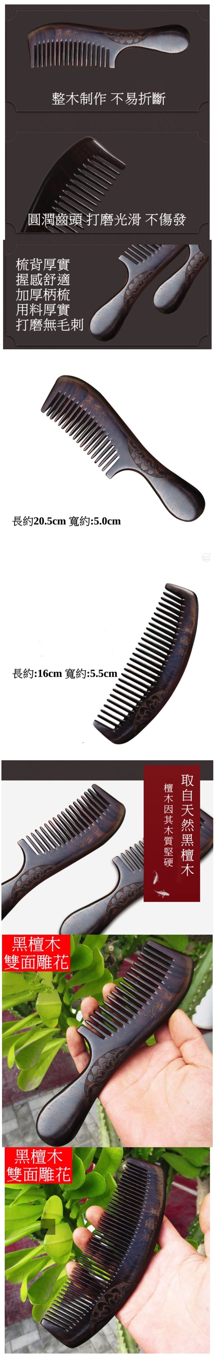 爆款防靜電按摩密齒雙面雕花天然黑檀木梳(中齒梳-帶把柄)