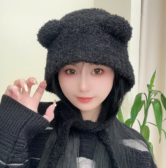 爆款小熊耳朵毛線系繩款針織帽(E-429卡其色)