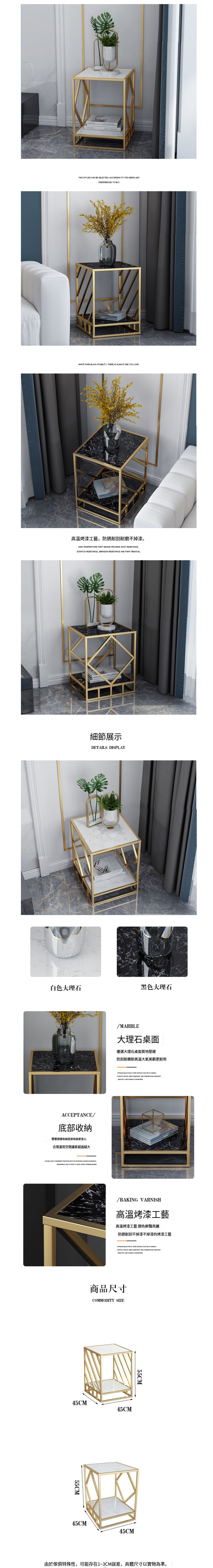 爆款臥室床頭櫃沙發邊桌(金色斜條紋桌+黑色大理石,45*45*55cm)