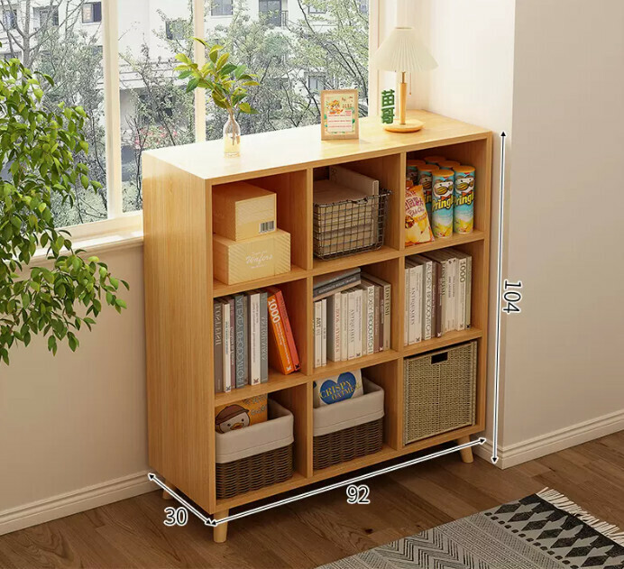 爆款書架置物架落地書櫃(帶腿九格原木色)