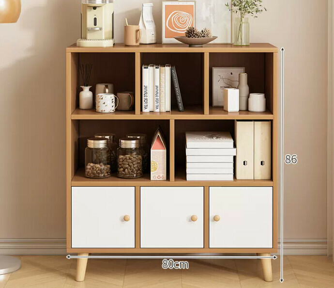 爆款書架置物架落地書櫃(帶腿五格三門原木色)