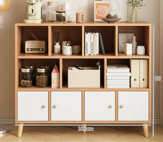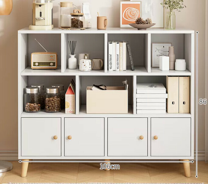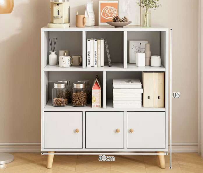 爆款書架置物架落地書櫃(帶腿五格三門暖白色)