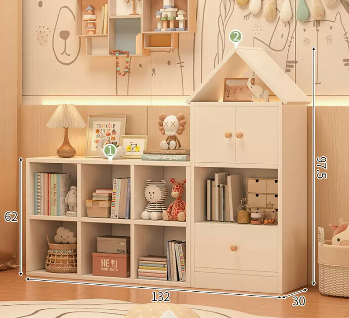 爆款兒童書架(小房子+六格櫃原木色加白門(組合款))