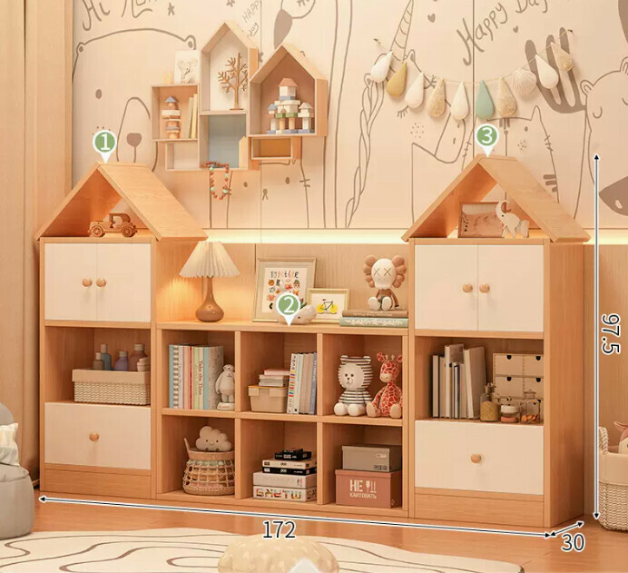 爆款兒童書架(小房子+六格櫃+小房子原木加白門(組合款))