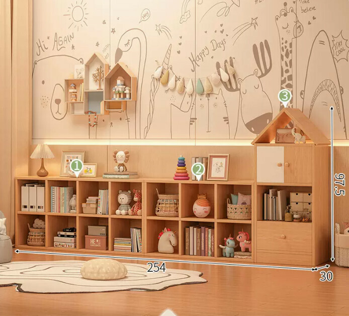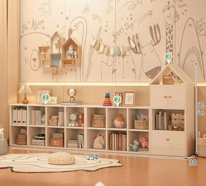 爆款兒童書架(小房子+六格+八格原木色加白門(組合款))