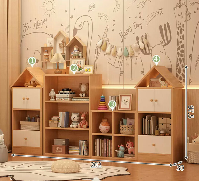 爆款兒童書架(小房子+田字格+三層櫃+小房子原木色加白門(組合款))
