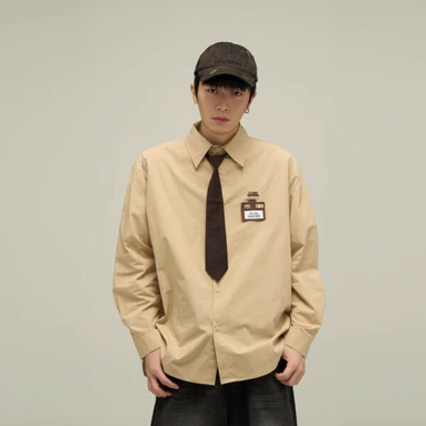 熱推學院風長袖襯衫領帶襯衣【卡其色M-XL碼,下單後與客服確認發貨尺碼】