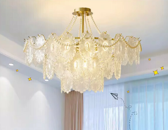 爆款奶油風珍珠水晶天花燈(60CM雙層內掛珍珠+三色光)