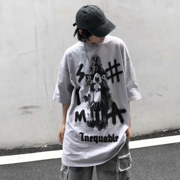爆款暗黑系塗鴉短袖惡魔少女印花【灰色M-2XL碼,下單後與客服確認發貨尺碼】