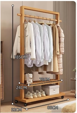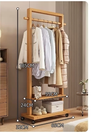 爆款落地實木衣帽架(高檔帶輪加高款-原木色105CM)