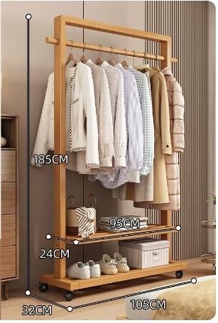 爆款落地實木衣帽架(高檔帶輪加高款-原木色65CM)