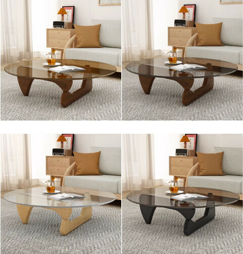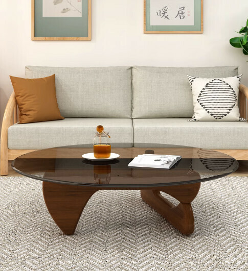 爆款玻璃三角形茶几【圓形(灰色玻璃+胡桃實木腿)】【尺寸:直徑70*高40cm】