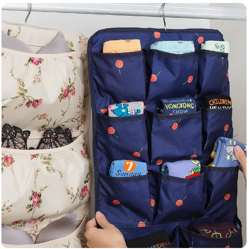 爆款門後懸掛式收納掛袋 襪子內衣架內褲架 雜物袋(深藍櫻桃【4層+13格】)(尺寸:36*78cm)