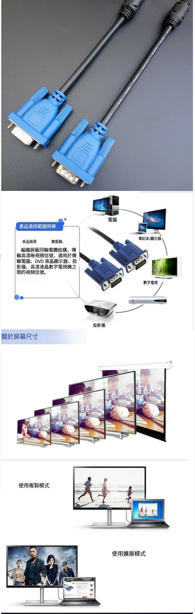 爆款高清VGA線【(3+4VGA線加粗高清版)白色】【長度9m】