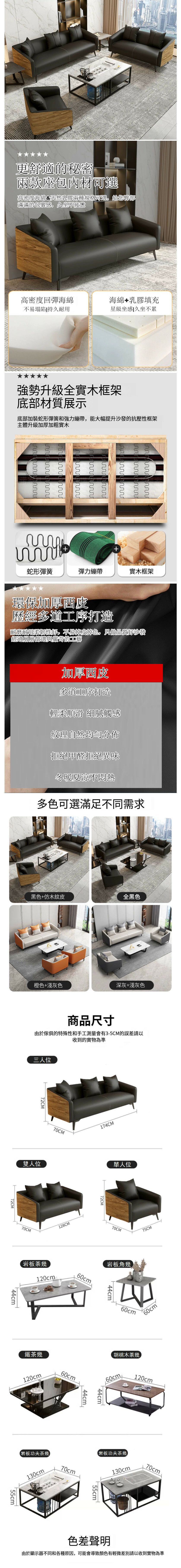 爆款高級北歐復古梳化(木紋色+黑色加厚PU西皮+乳膠坐墊) (3坐+1坐+1坐+白色岩板茶几)