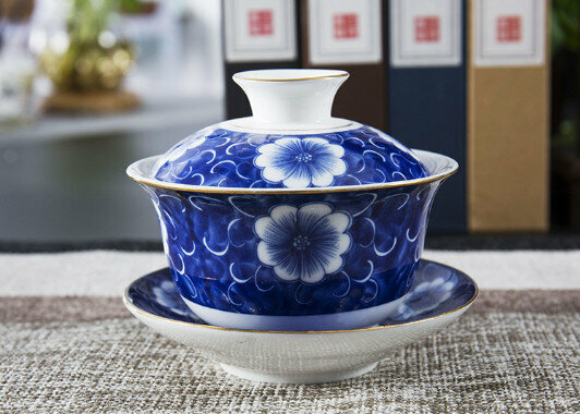 爆款家用簡質陶瓷蓋碗茶杯(青花太陽花)