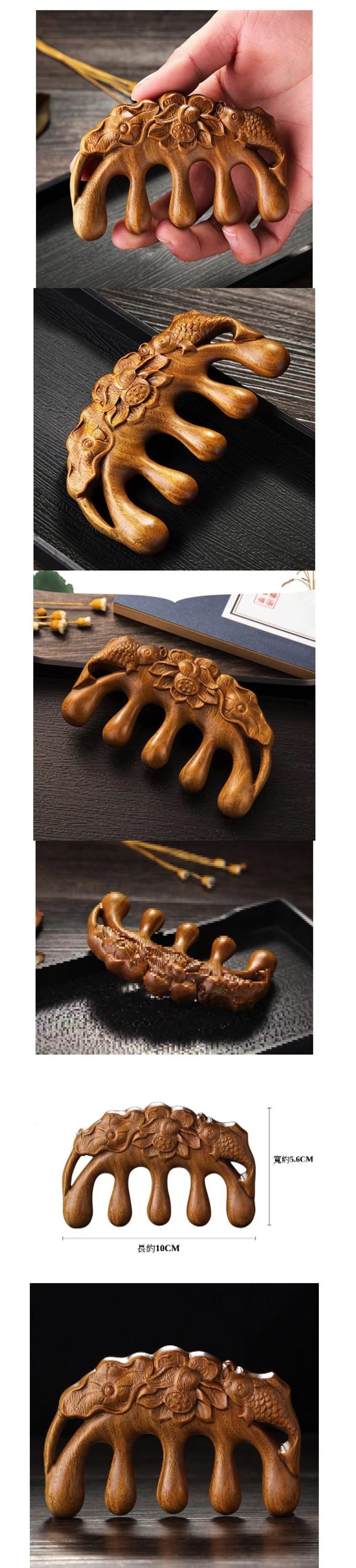 爆款按摩頭療金絲檀木梳 頭部經絡五齒梳(荷葉魚梳布袋裝-主圖片隨機1個)