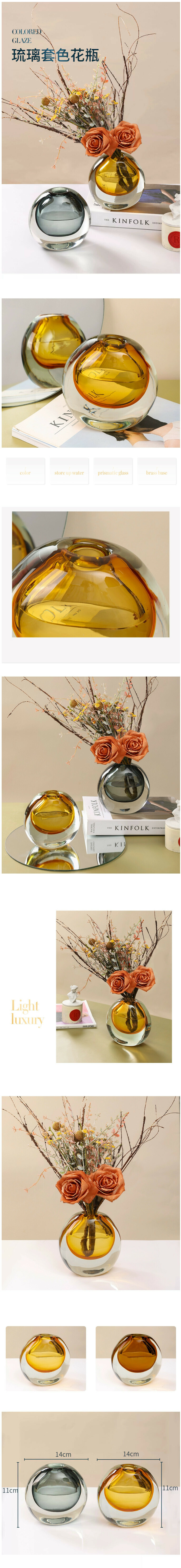 爆款現代簡約玻璃花瓶擺件裝飾品(琉璃套色花瓶(孔雀藍)+黃針墊花)