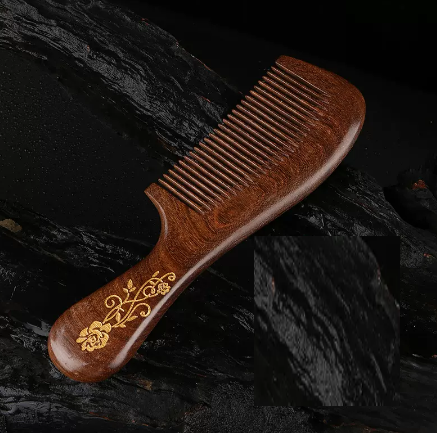 爆款天然檀香雕花描金桃木梳子(水滴柄檀木梳-玫瑰花)(尺寸:長180寬59mm)