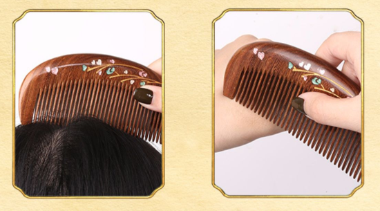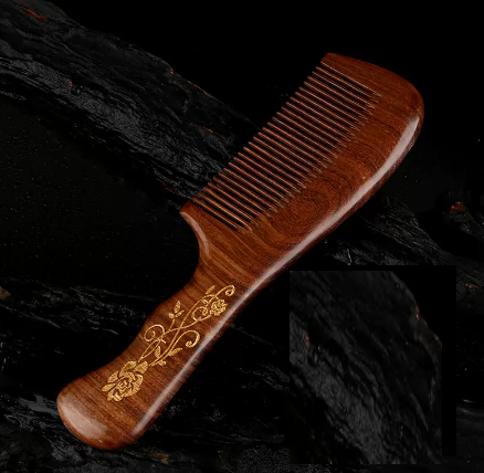 爆款天然檀香雕花描金桃木梳子(波浪柄檀木梳-玫瑰花)(尺寸:長187寬53mm)