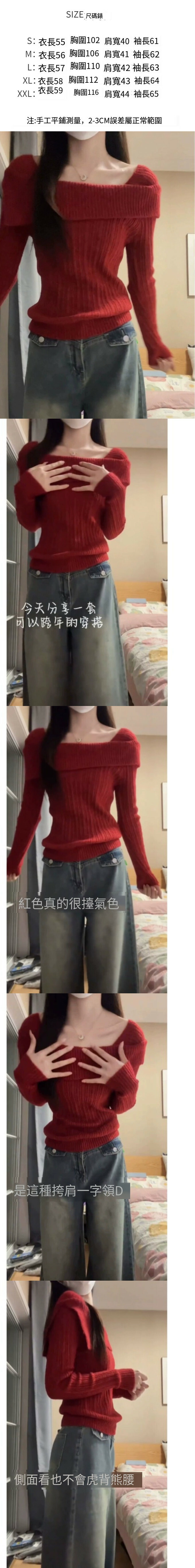 爆款一字肩漏鎖骨毛衣(紅色)(S/M/L/XL下單後與客服聯系發貨的尺碼)