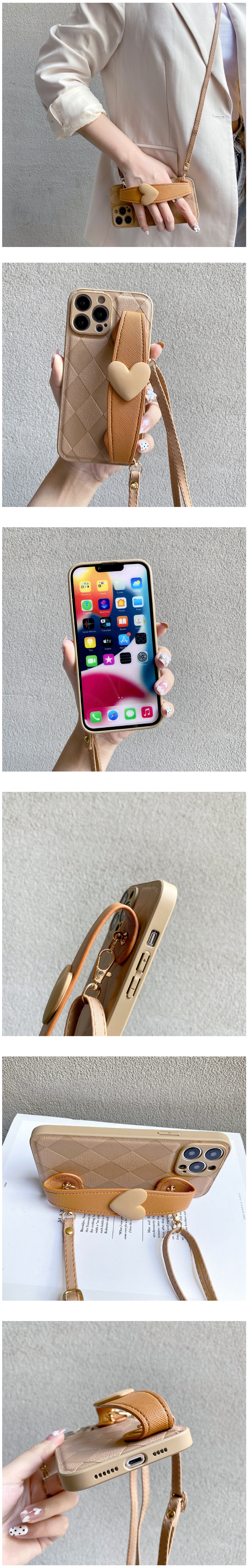 爆款格紋愛心腕帶手機殼+斜跨繩(TY2卡其色)(適用於蘋果-華為)(下單後聯絡客服確認手機型號)