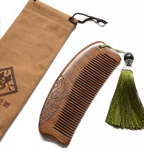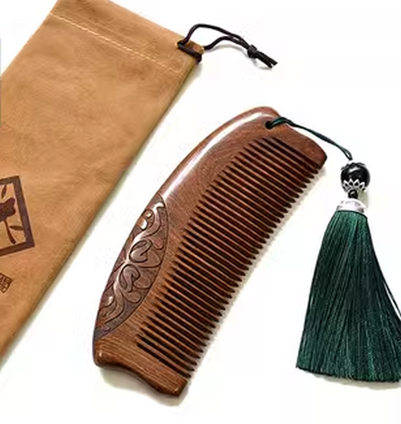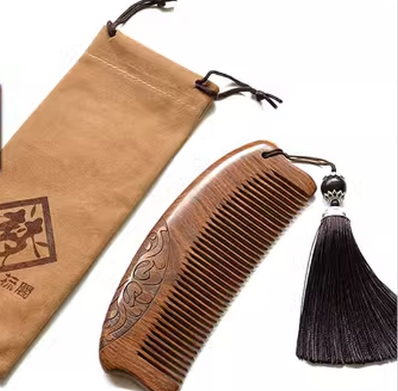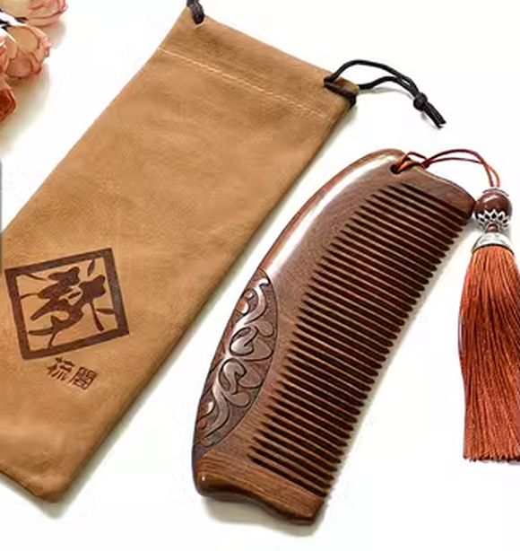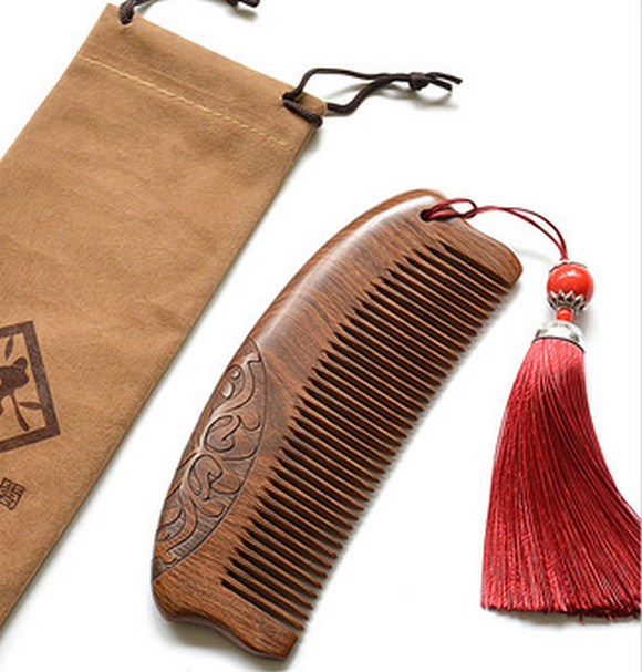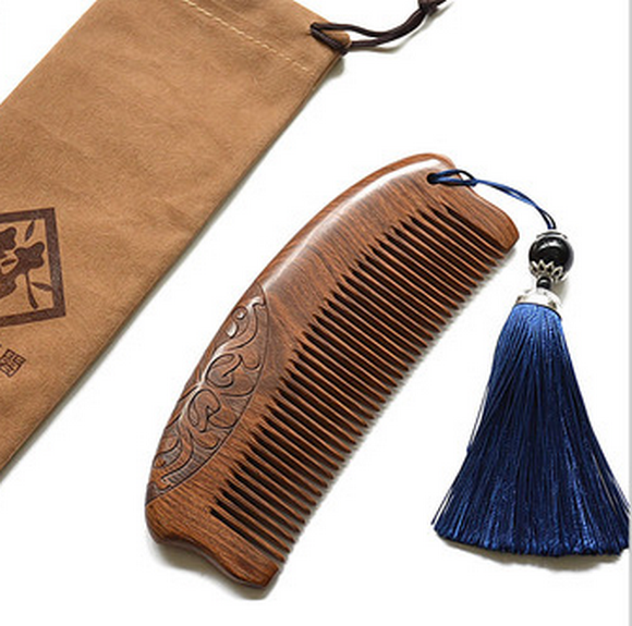 爆款檀木梳子雕刻防脫髮(藏藍色流蘇(布袋裝)長約15釐米)