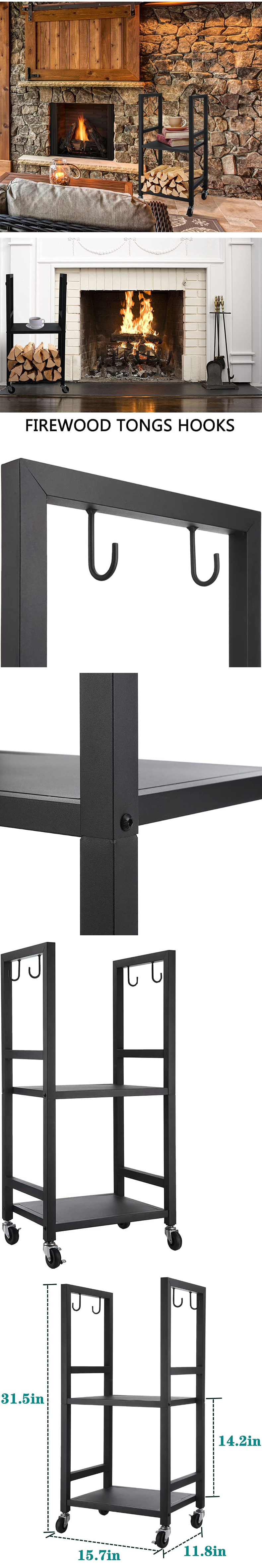 爆款簡約柴火架木材存儲收納架(帶輪子和掛鉤)(黑色,62*25*62cm)