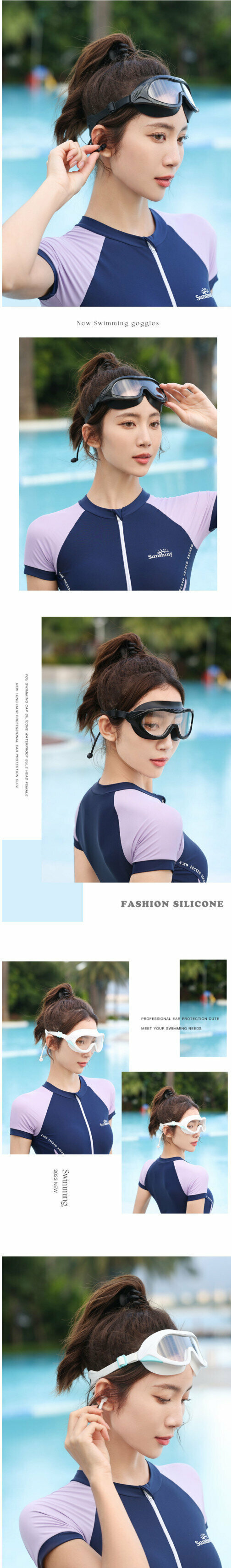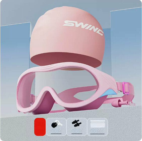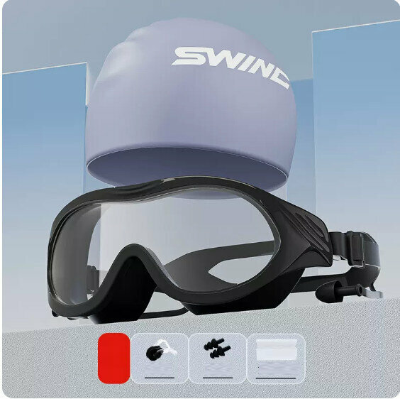 爆款夏季防水防霧大框游泳眼鏡泳帽套裝(象牙白+波浪泳帽【矽膠帽】)