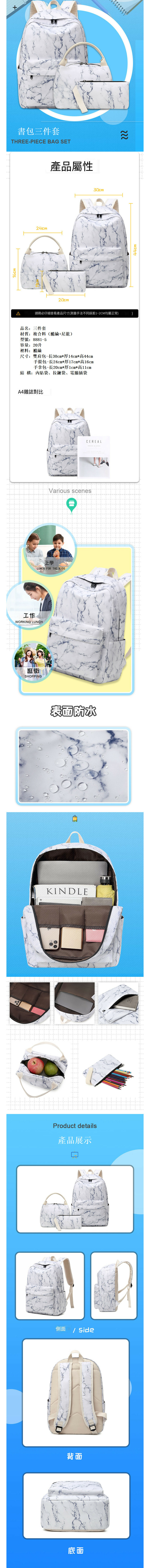 爆款背包潮人 旅行背囊 學生書包 電腦袋 行山背囊 【三件組合】 (雲石紋花)