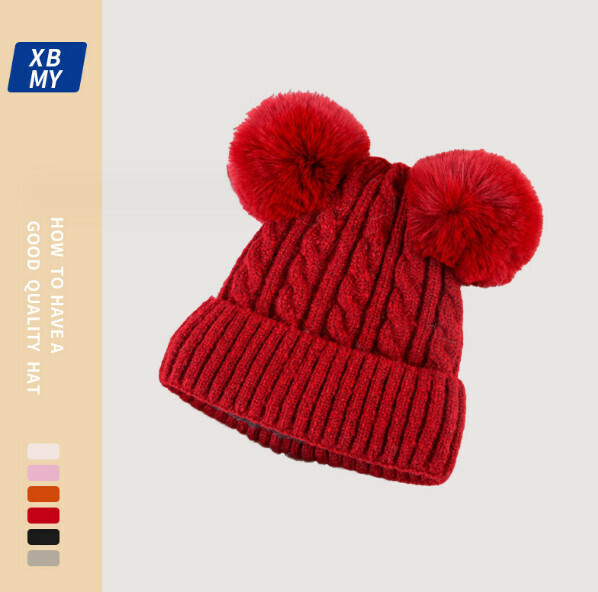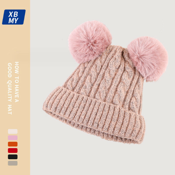 爆款加絨雙毛球套頭針織帽(A-113米色)