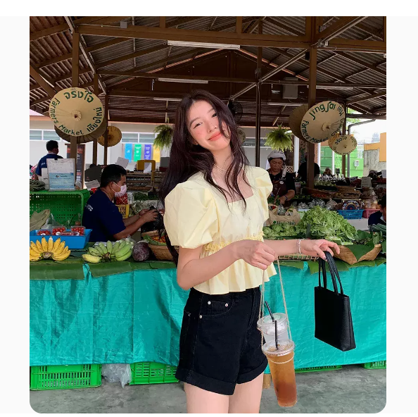 熱賣泡泡袖短款短袖上衣(黃色 尺碼:S-3XL)(下單後請聯絡客服確認發貨尺碼)