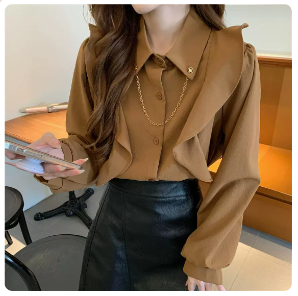 激抵荷葉邊鏈條襯衫(咖啡色 尺碼:S-3XL)(下單後請聯絡客服確認發貨尺碼)