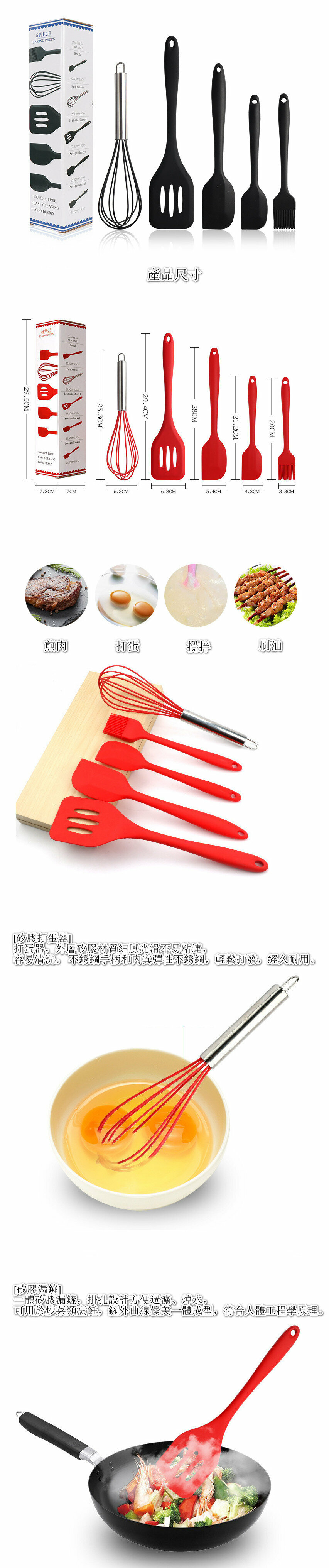 爆款矽膠廚具烘焙工具套裝 黑色【五件套黑色(小號一體刷 、刮刀 大號刮刀打蛋器漏鏟)】