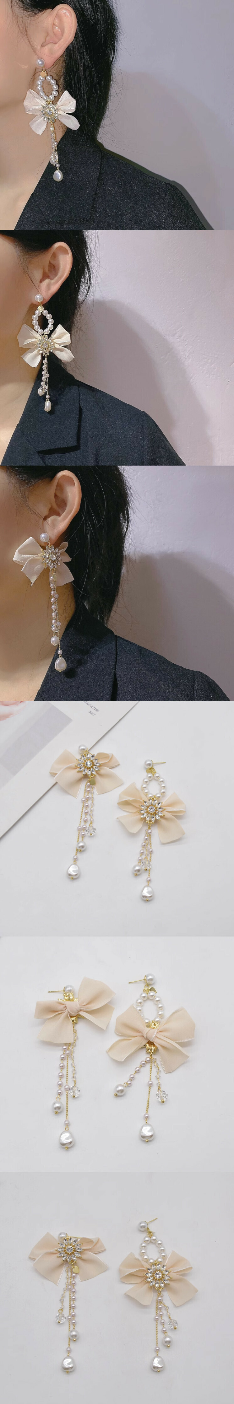 絲帶蝴蝶結仿珍珠長款流蘇耳環