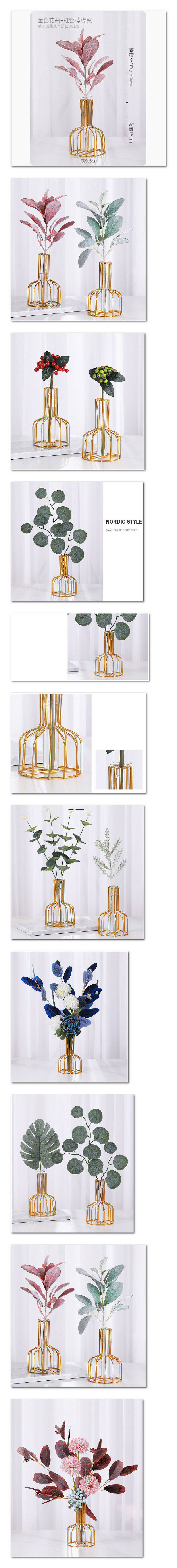 新款簡約幾何鐵藝花器假花裝飾擺件(金色水培花瓶+綠色檸檬葉)