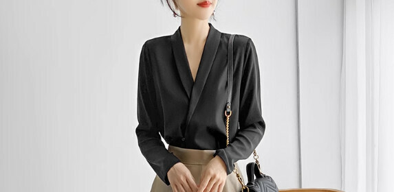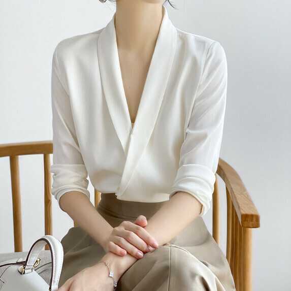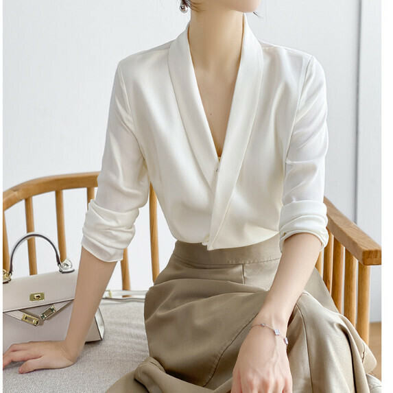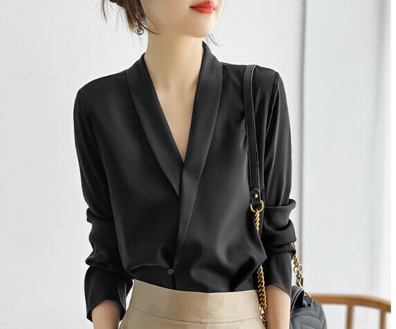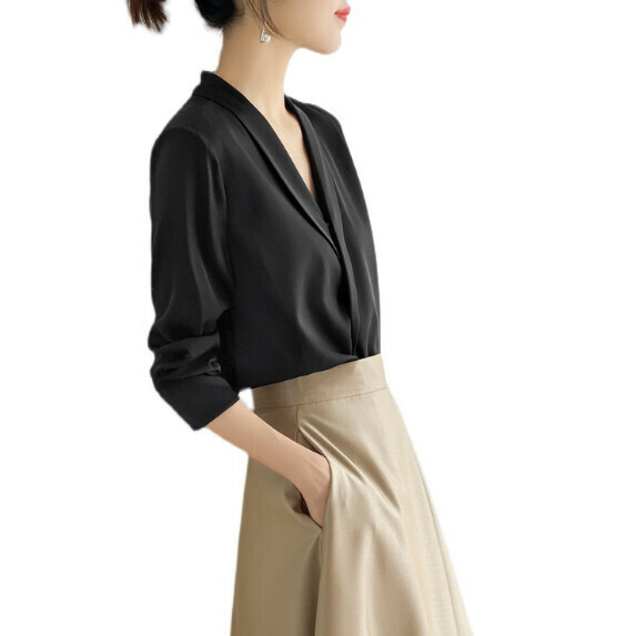 熱推簡約V領長袖襯衫女春秋(黑色【S_3XL碼】(下單後聯繫客服確認發貨尺碼)】