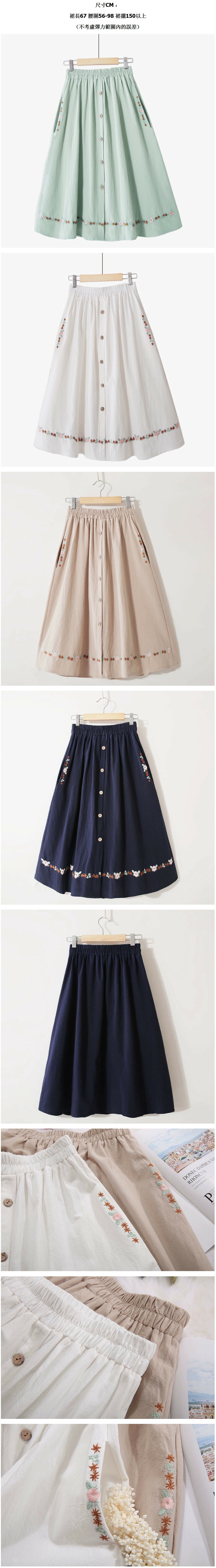 新款單排扣棉麻半身裙(藏青【小花刺繡口袋】1719#均碼 鬆緊腰)