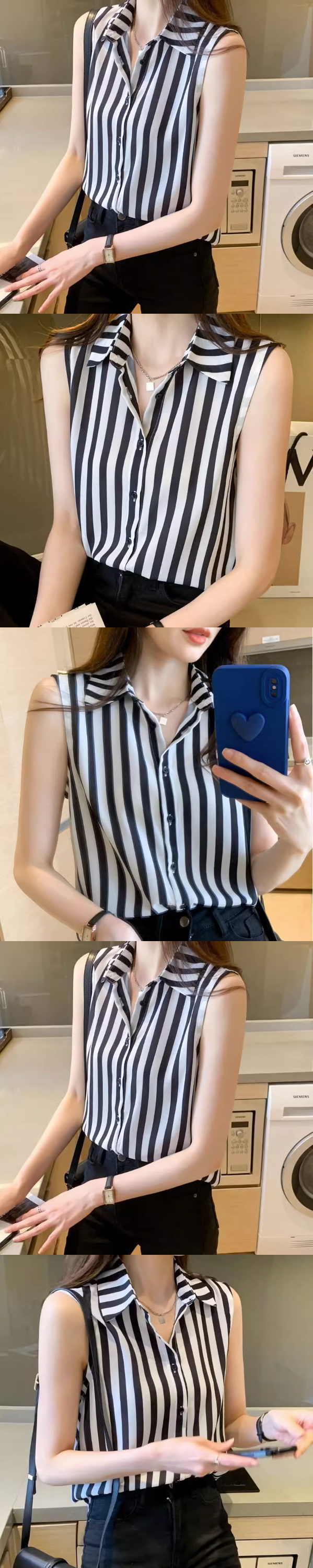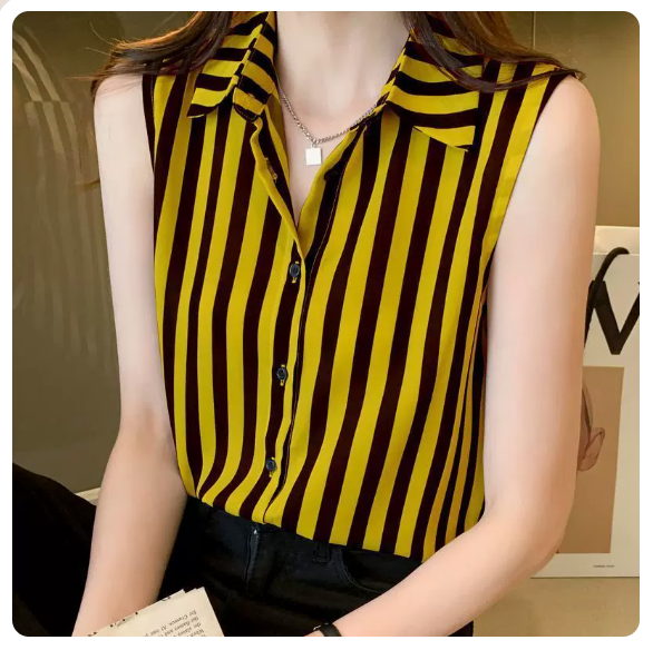 熱推無袖背心條紋雪紡襯衫(黃色 尺碼:S-3XL)(下單後請聯絡客服確認發貨尺碼)