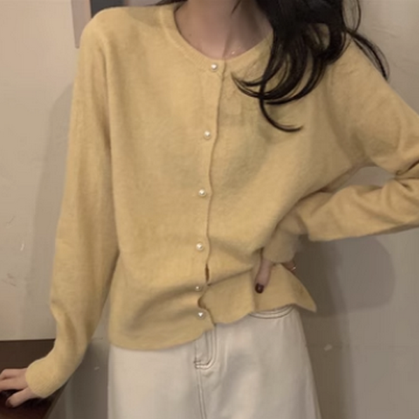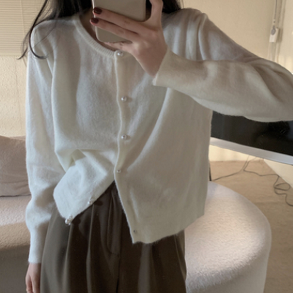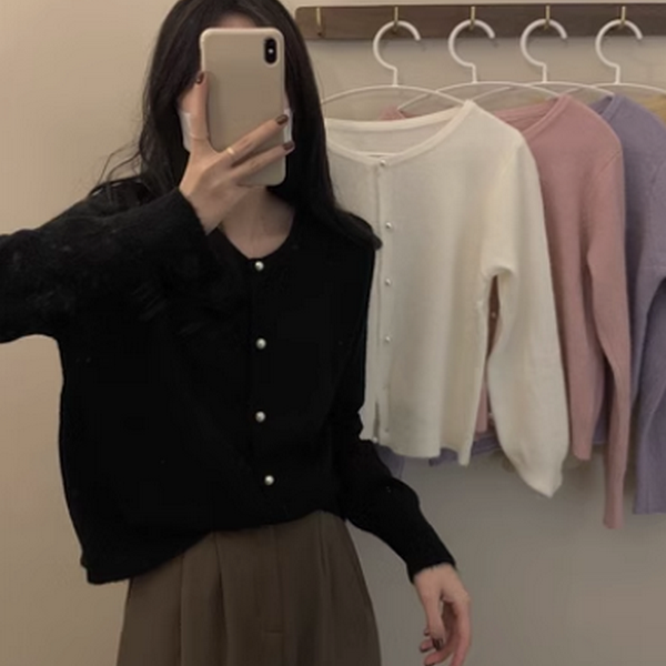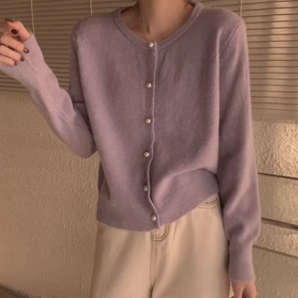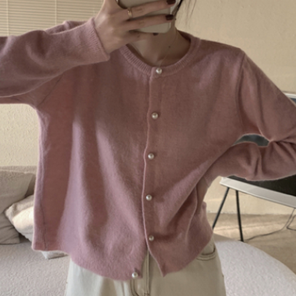 慵懶風軟糯圓領珍珠扣溫柔毛衣針織開衫