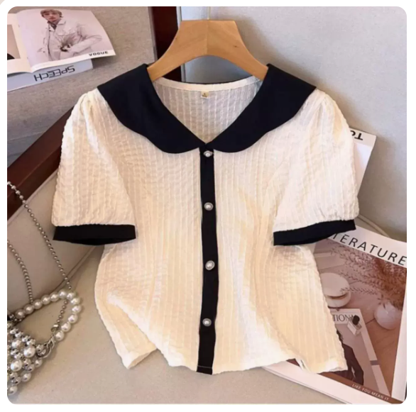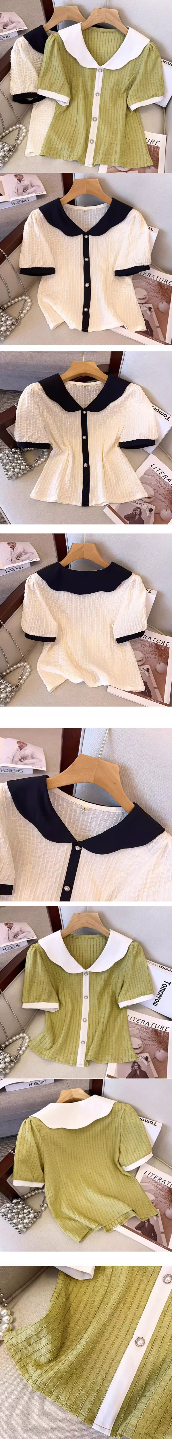 熱賣拼接上衣娃娃領襯衫(杏色 尺碼:S-3XL)(下單後請聯絡客服確認發貨尺碼)