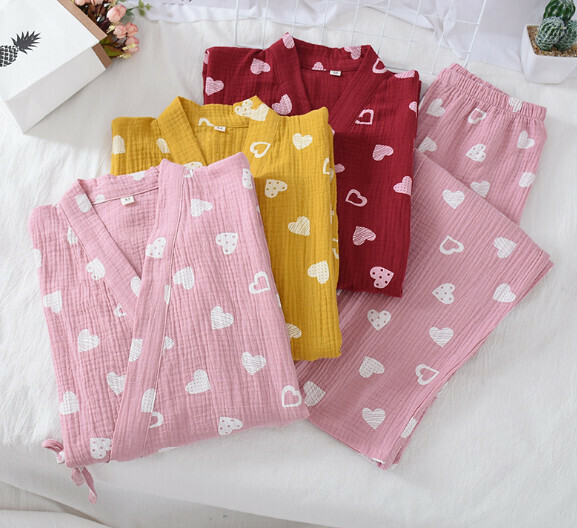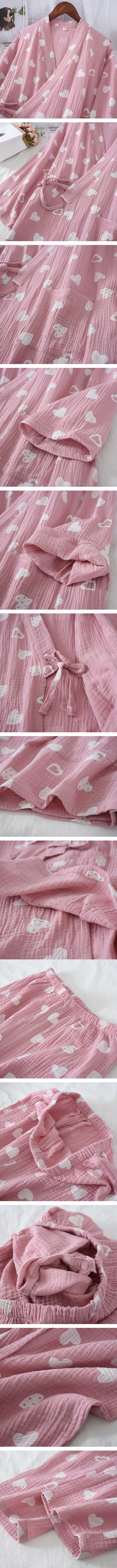 新款春秋款全棉縐布和服睡衣(酒紅色雙心)【M-XL碼】【下單後聯絡客服確認發貨尺碼】