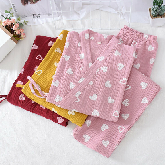 新款春秋款全棉縐布和服睡衣(粉色雙心)【M-XL碼】【下單後聯絡客服確認發貨尺碼】