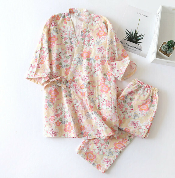 激抵春秋季紗布七分袖和服睡衣(粉底櫻花)【M-XL碼】【下單後聯絡客服確認發貨尺碼】